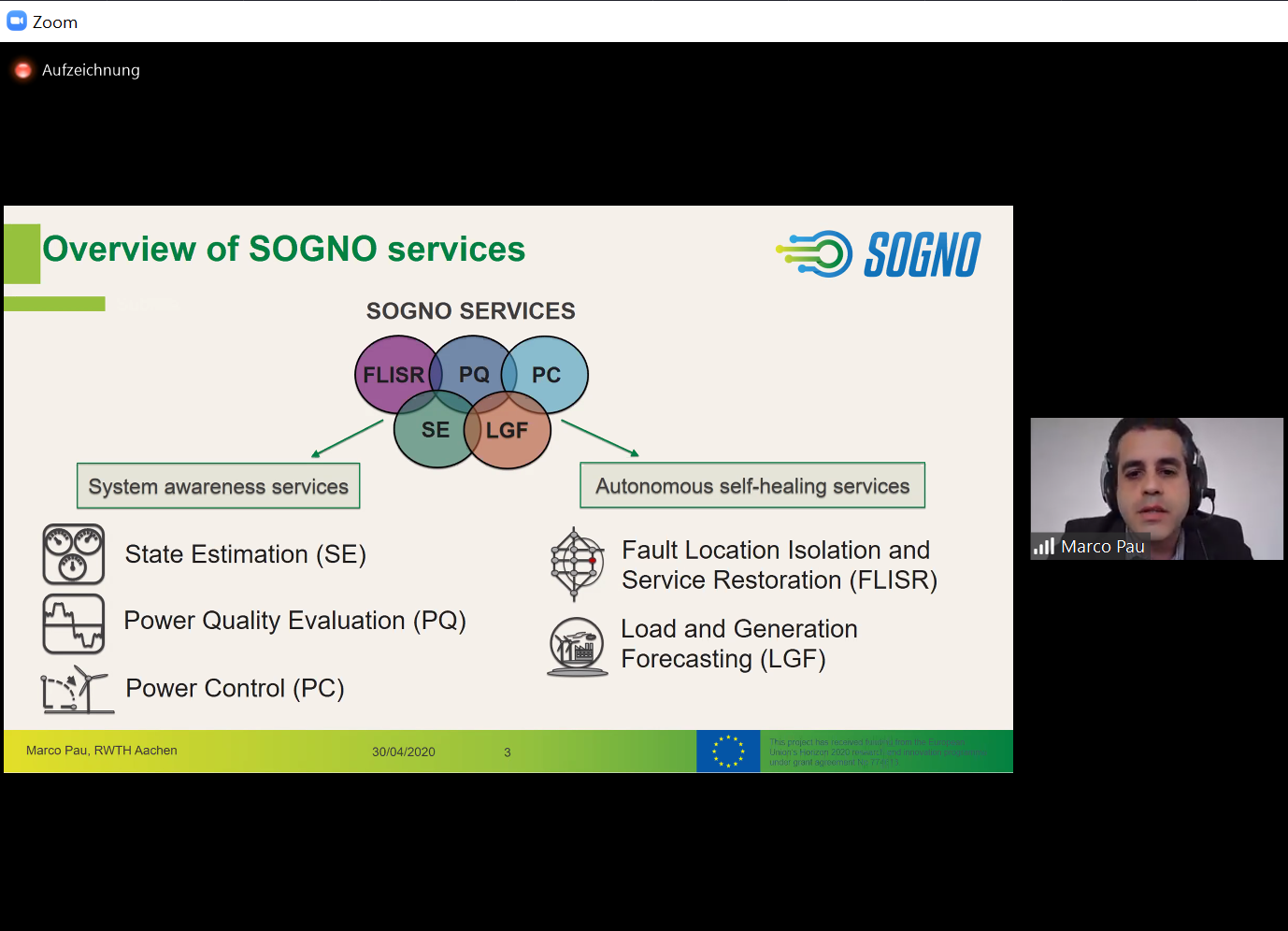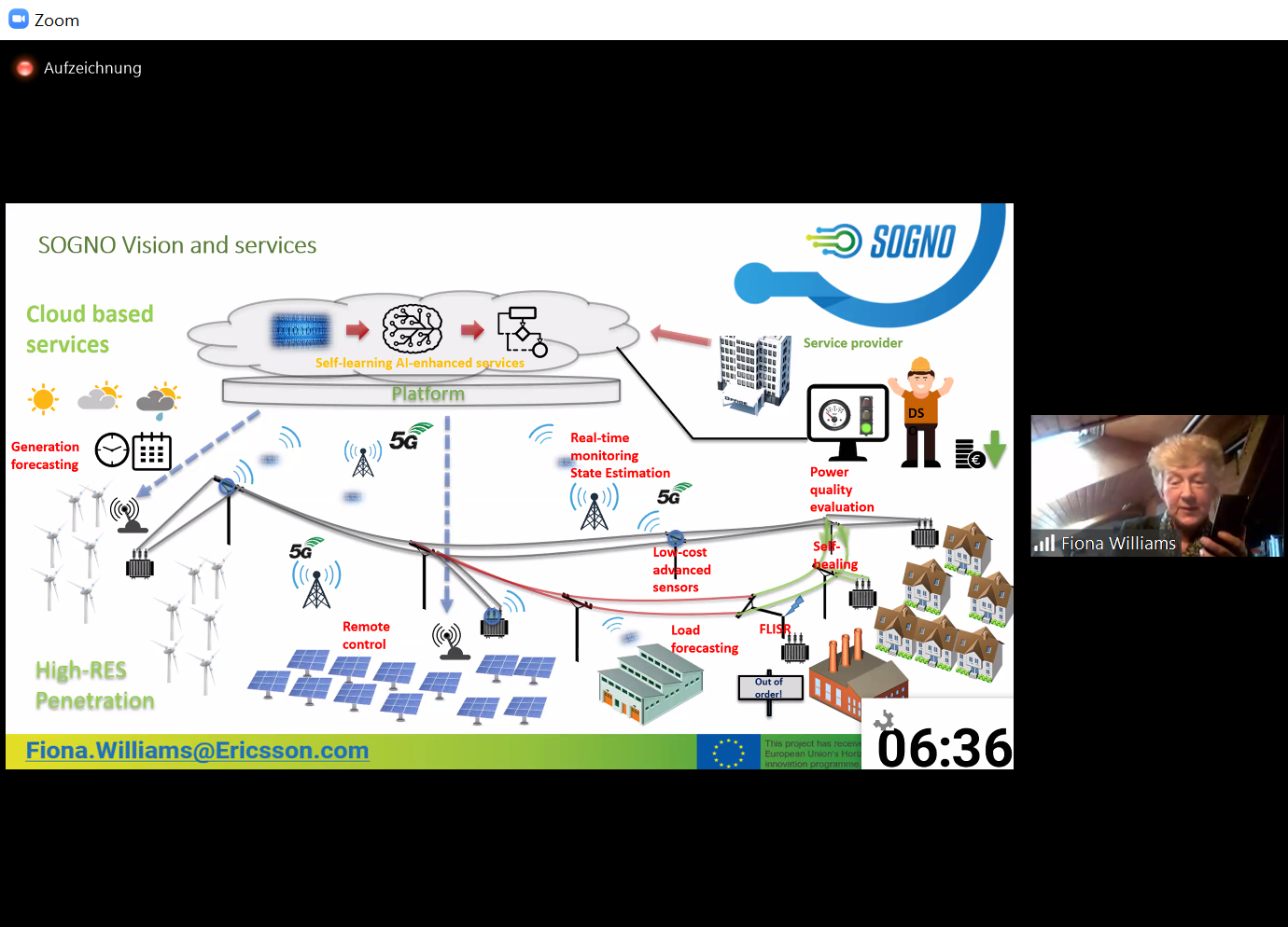 SOGNO was presented by the project coordinator, Fiona Williams from Ericsson, as well as the technical coordinator, Antonello Monti, followed by a contribution of Marco Pau from RWTH. The interest in SOGNO was very high, which was clearly reflected in the more than twenty questions that were answered by Prof. Monti in the chat.